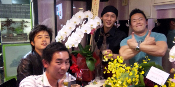 右からマッスルなコイケその隣がハラダその次がポップス(初めて喋った)その隣の人の名前を忘れてしまいました(酔ってたんです、すいません)。